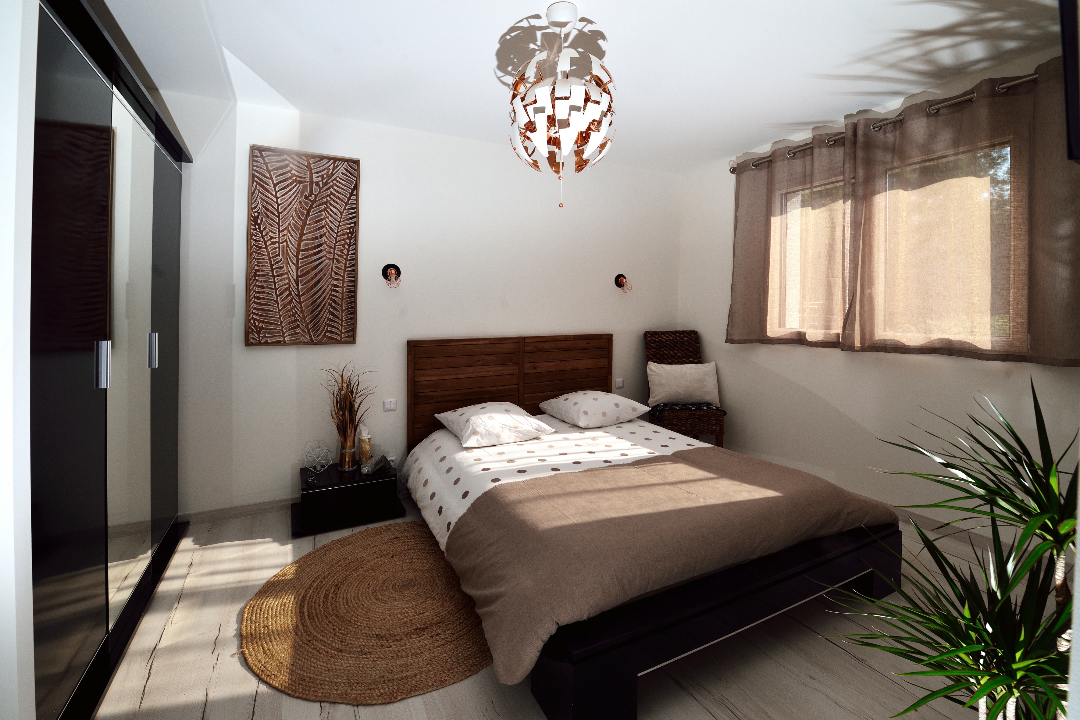 L’étage de cette maison est réservé à la partie nuit. L’escalier ouvre sur une mezzanine de 10 m². Cet étage distribue une grand chambre de 16 m² et deux autres de 9 et 10 m², une grande et belle salle de bain de 9 m² dotée d’une baignoire d’angle, d’une douche et d’un double vasque ainsi qu’un WC indépendant. Les chambres et la salle de bains sont spacieuses et confortables car elles ne possèdent pas de mansarde et disposent de grandes fenêtres.